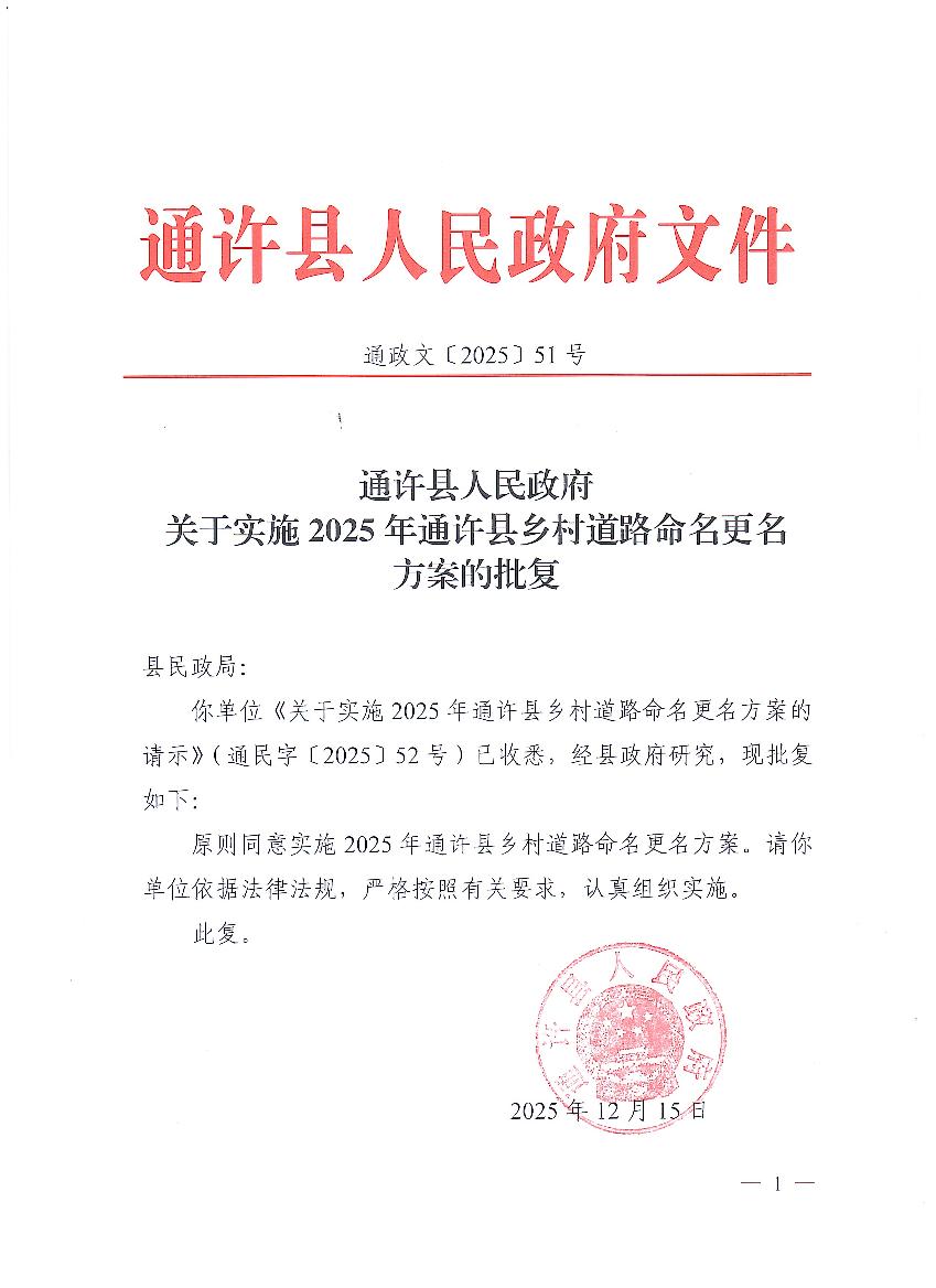 通许县人民政府关于实施2025年通许县乡村道路命名更名方案的批复